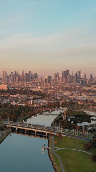 Melbourne skyline at dawn, tranquil river and urban beauty